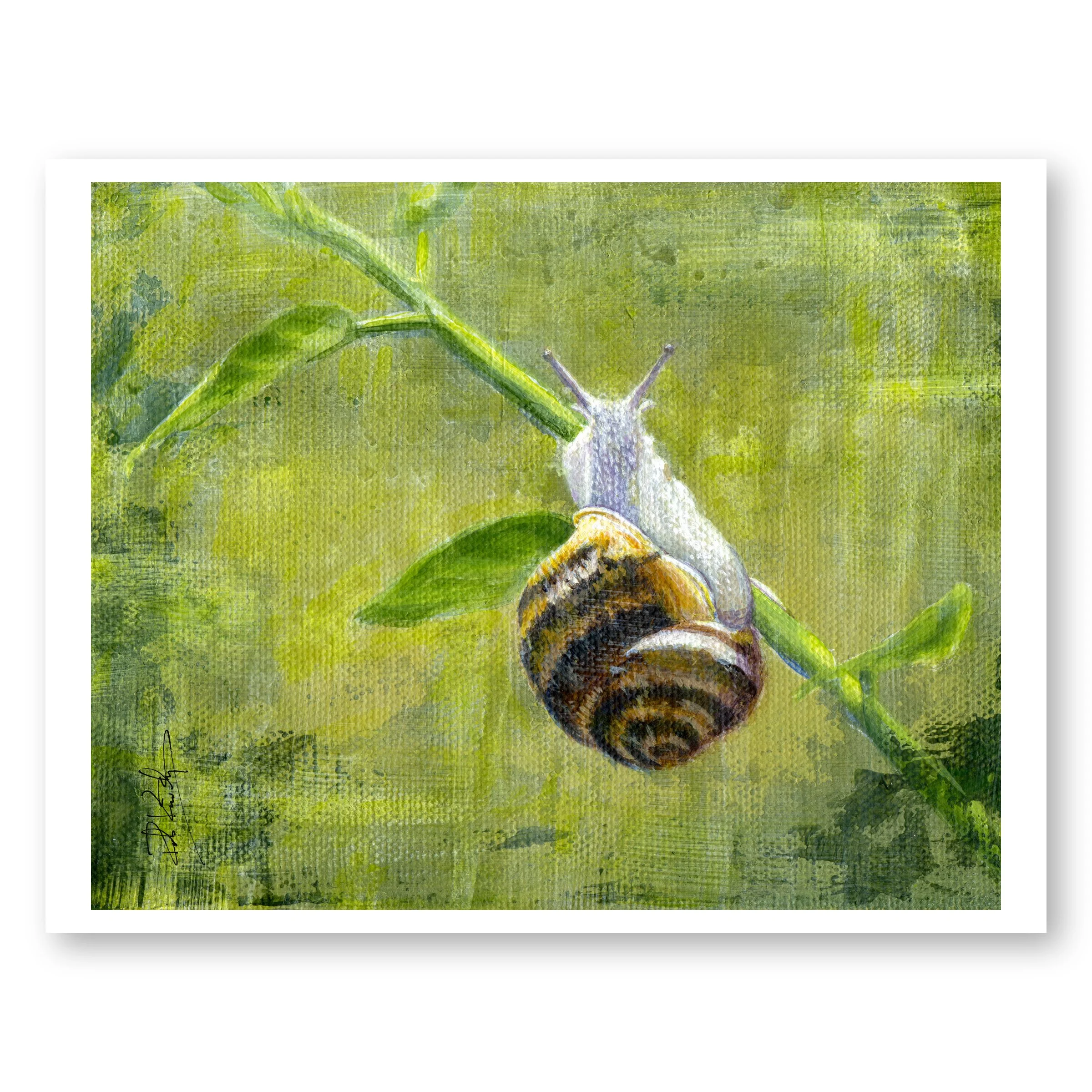 Abstract organic shapes from the garden beyond compliment the fine details in this peaceful snail.