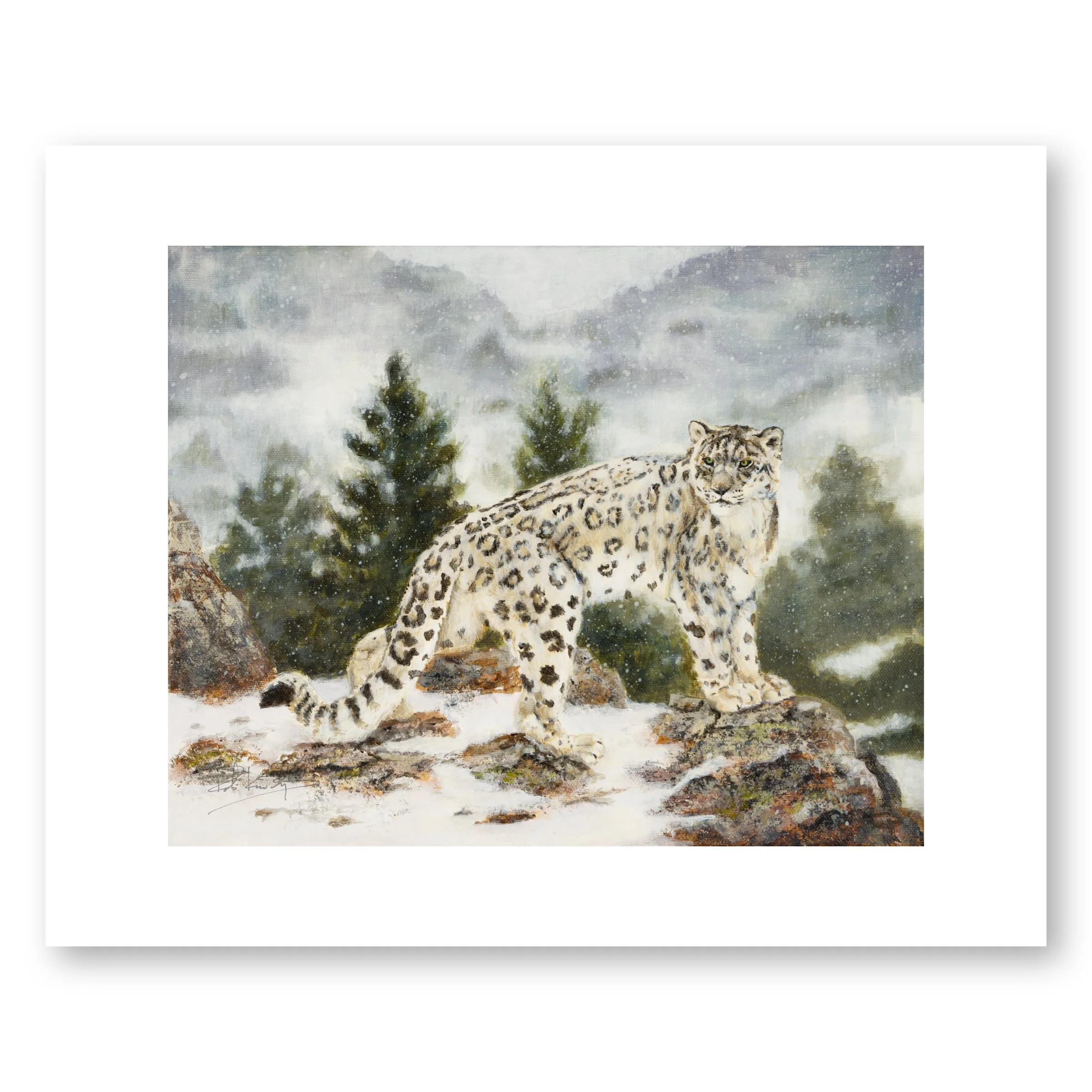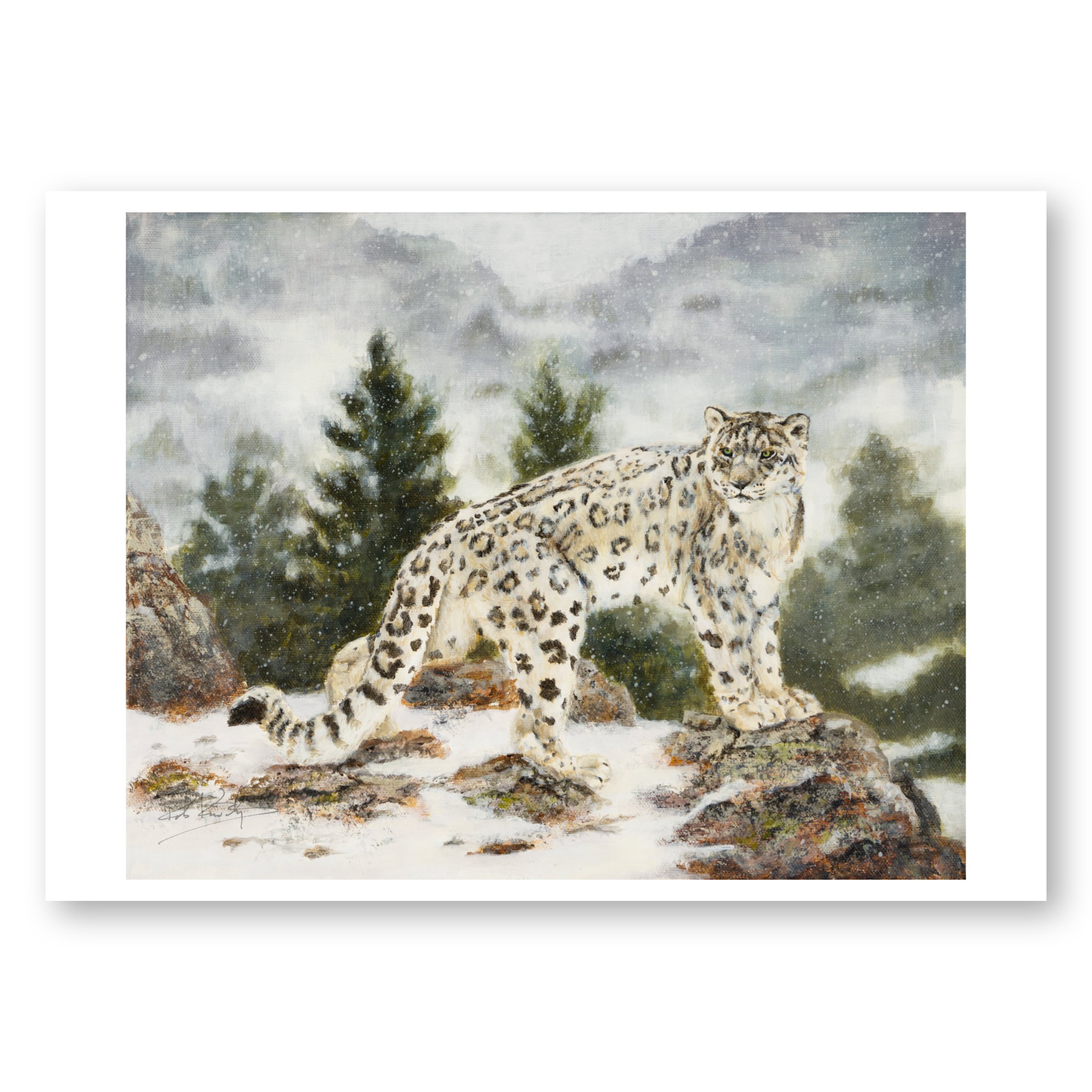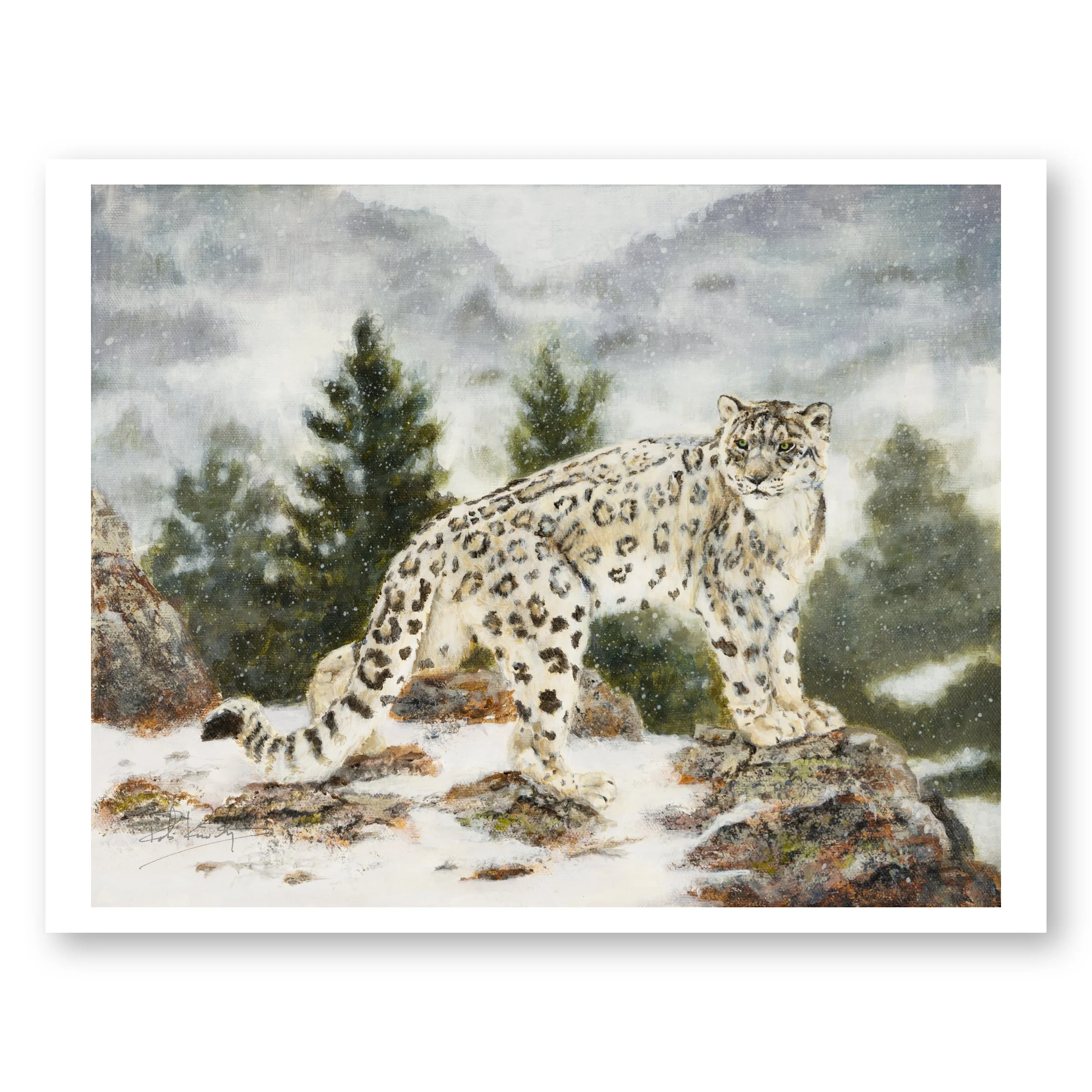 The beautiful snow leopard patrolling a ridge, pines covering the distant mountainside can be seen through the misty snowfall.