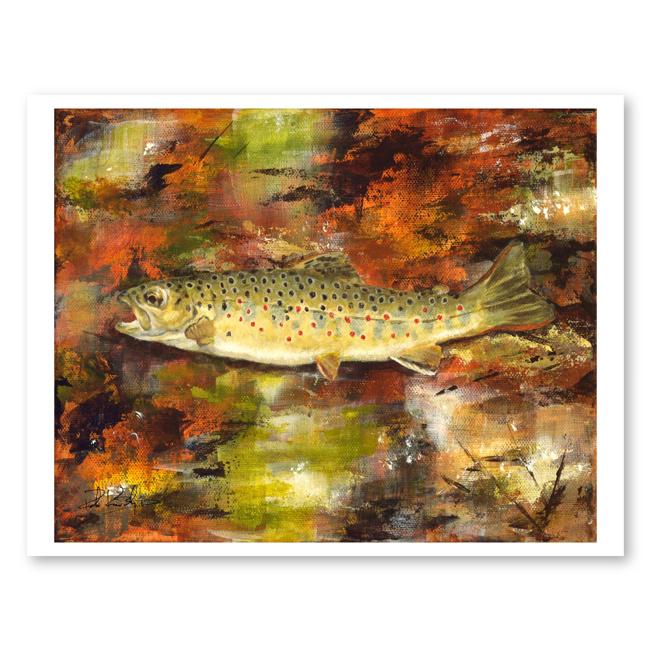 I love the intricate markings of the wild brown trout in the Smokies. This painting has background colors and an abstract pattern inspired by the photo I took of this guy. The trout gets a more detailed treatment, especially up near the head.