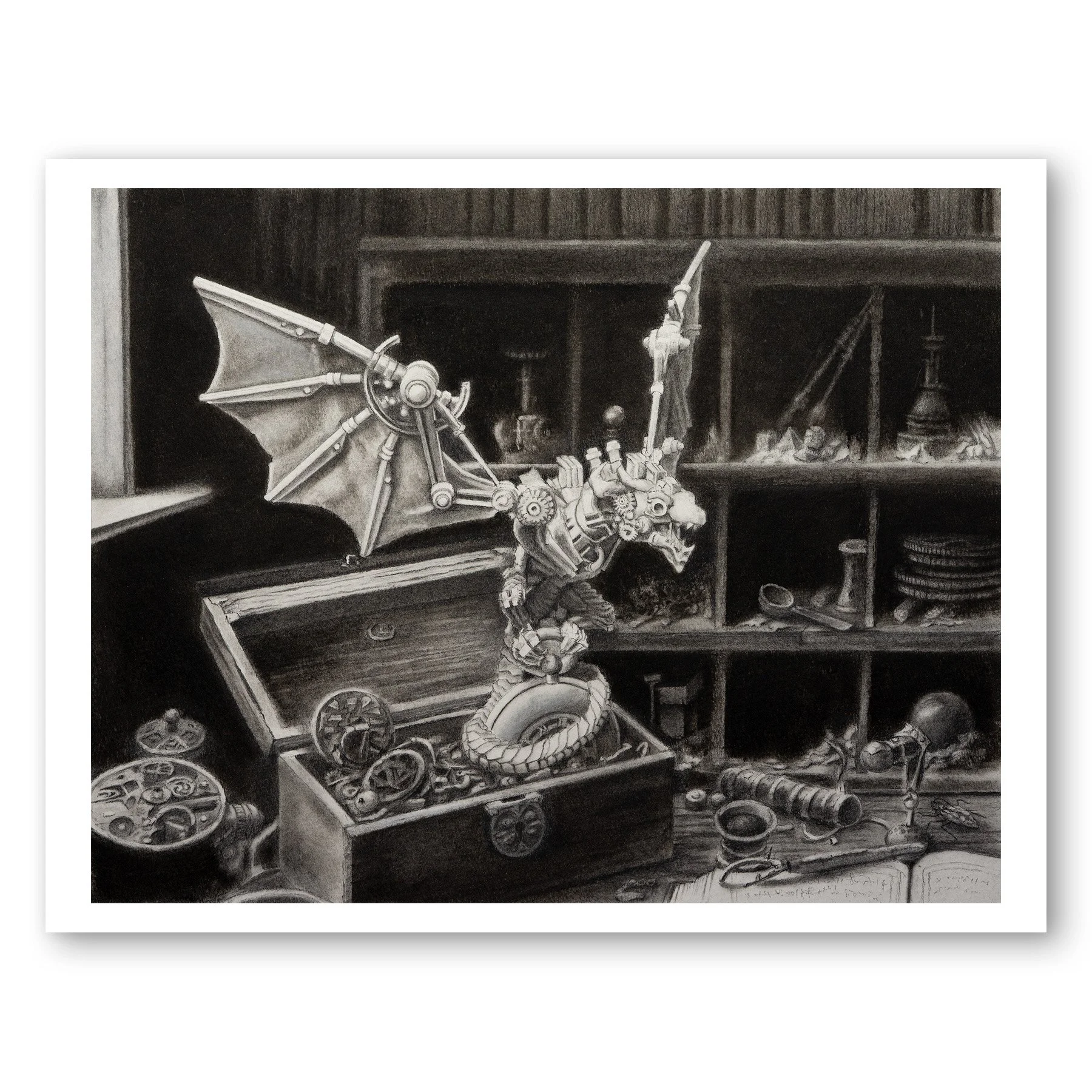 Weary of messing about by himself in his workshop, the tinkerer created a pet for himself. Infused with magic it came to life and now watches as the craftsman continues his never-ending work.